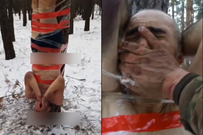 영상엔 한 눈 덮인 설산에서 러시아군 병사들로 추정되는 두 남성이 속옷 차림으로 각각 나무에 묶여 있는 모습이 담겼다.