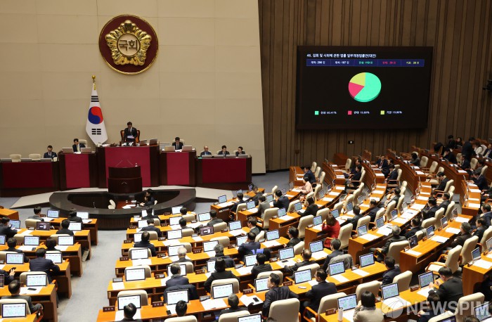[서울=뉴스핌] 정일구 기자 = 29일 오후 서울 여의도 국회에서 열린 본회의에서 집회 및 시위에 관한 법률 일부개정법률안(대안)이 가결되고 있다. 2026.01.29 mironj19@newspim.com