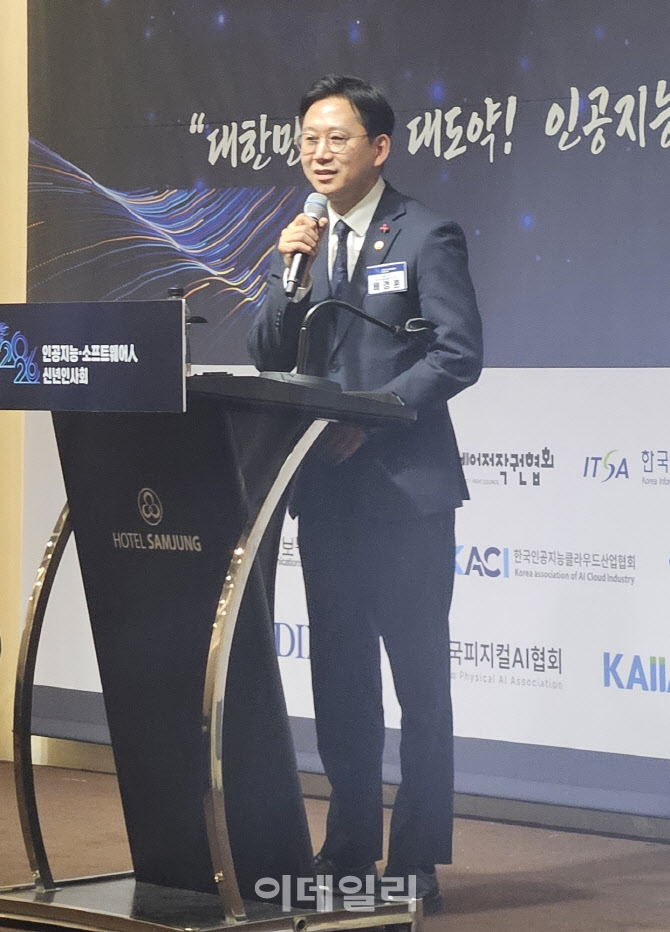 배경훈 부총리 겸 과학기술정보통신부 장관이 29일 서울 삼정호텔에서 한국인공지능·소프트웨어산업협회(KOSA)를 비롯한 15개 인공지능·소프트웨어 관련 협·단체가 공동 주최한 ‘2026년 인공지능·소프트웨어인 신년인사회’에 참석해 발언하고 있다.