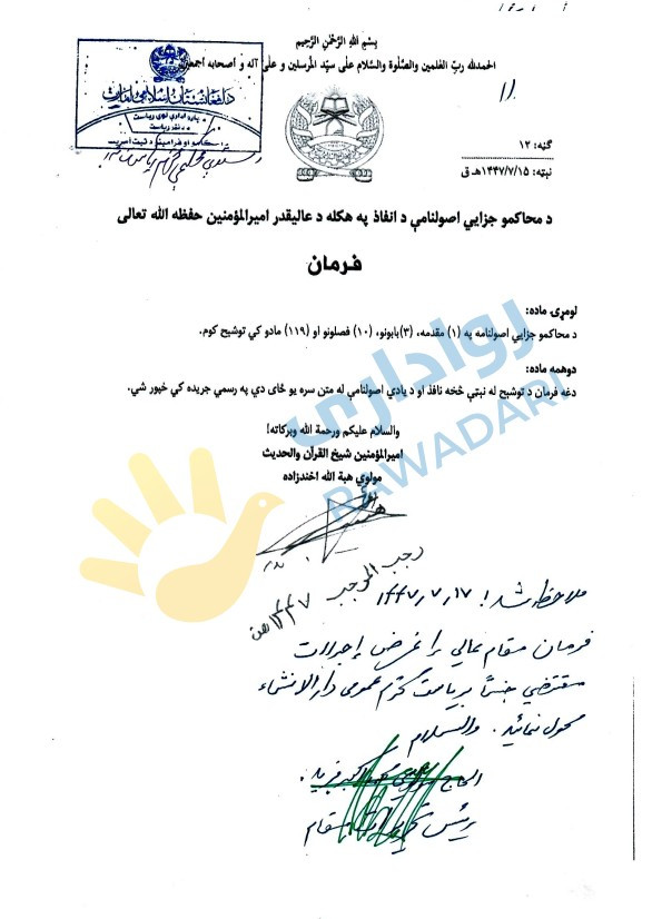 22일(현지시간) 아프가니스탄 인권단체 라와다리는 이슬람 무장 단체 탈레반 최고지도자인 하이바툴라 아쿤자다 서명을 받아 전국 지방 법원에 배포된 '법원용 형사소송법' 사본을 입수했다고 밝혔습니다.