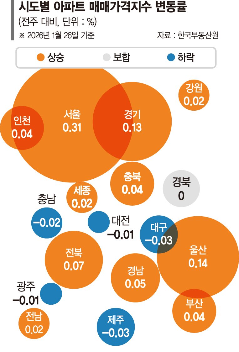 29일 한국부동산원 주간 아파트가격 동향에 따르면 1월 4주(26일 기준) 서울 아파트 가격은 전주 대비 0.02%p 오른 0.31%로 나타났다. 선호도가 높은 역세권·대단지·학군지, 재건축 추진 단지를 중심으로 매수문의가 지속되며 상승거래가 체결된 영향을 받았다.