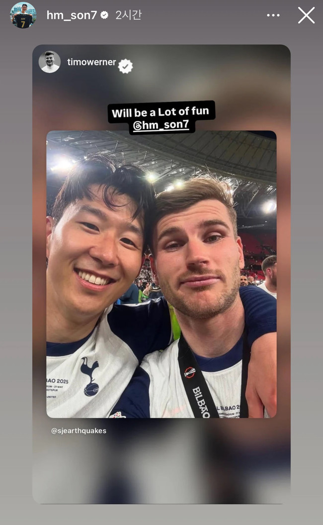 MLS에 합류한 베르너는 토트넘에서 호흡을 맞췄던 손흥민과 맞대결을 펼칠 예정이다. 산호세 어스퀘이크는 공식 SNS에 손흥민과 베르너의 사진을 올리며 다가오는 9월 예정된 LAFC와 경기를 예고했다. 베르너가 "정말 재미있을 거야"라며 이를 자신의 SNS에 공유했다. 손흥민 역시 베르너의 게시물을 공유했다.