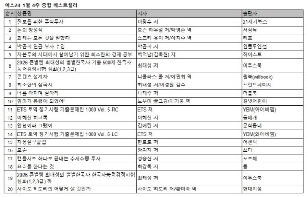 예스24 1월 4주 종합 베스트셀러 순위에서 광수네복덕방 대표이자 경제 분야 전문가인 이광수 교수의 ‘진보를 위한 주식투자’가 4주 연속 1위에 올랐다. 모건 하우절의 신작 ‘돈의 방정식’은 지난주보다 한 계단 상승한 2위를 차지했으며, 2025년 아쿠타가와상 수상작 ‘괴테는 모든 것을 말했다’가 3위에 올랐다. 109만 투자 멘토 ‘박곰희TV’의 ‘박곰희 연금 부자 수업’은 4위로 진입했고, 경제 전문 크리에이터이자 투자 교육 강사 백억남의 ‘자본주의 시대에서 살아남기 위한 최소한의 경제 공부’는 5위를 기록했다.