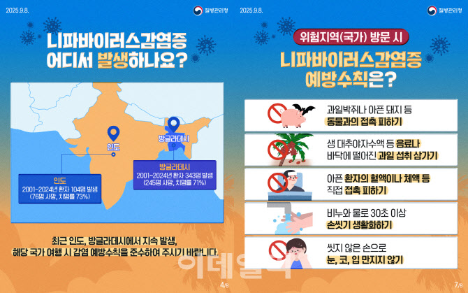 임승관 질병청장은 “니파바이러스감염증을 제1급 감염병으로 지정해 철저히 대비하고 있다”며 “현재 인도 외 국가에서는 추가 발생 사례가 없지만, 감염 시 치명률이 높은 만큼 감염 위험에 노출되지 않도록 각별히 주의해야 한다”고 당부했다.