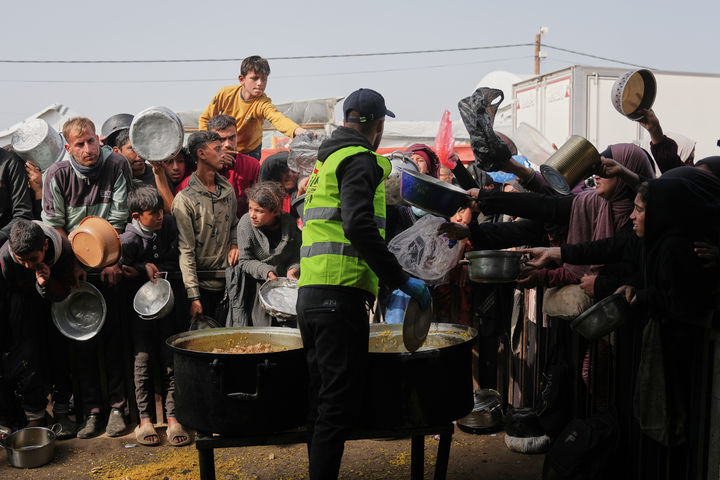 [칸유니스=AP/뉴시스] 23일(현지 시간) 가자지구 남부 칸유니스의 급식소에서 음식을 받으려는 팔레스타인 주민들이 필사적으로 몰려들고 있다. 29일(현지 시간) 현지 언론에 따르면 이스라엘이 가자지구 전쟁으로 사망한 팔레스타인이 7만 명을 넘었다는 하마스 측 통계를 인정하기로 했다. 2026.01.30. |