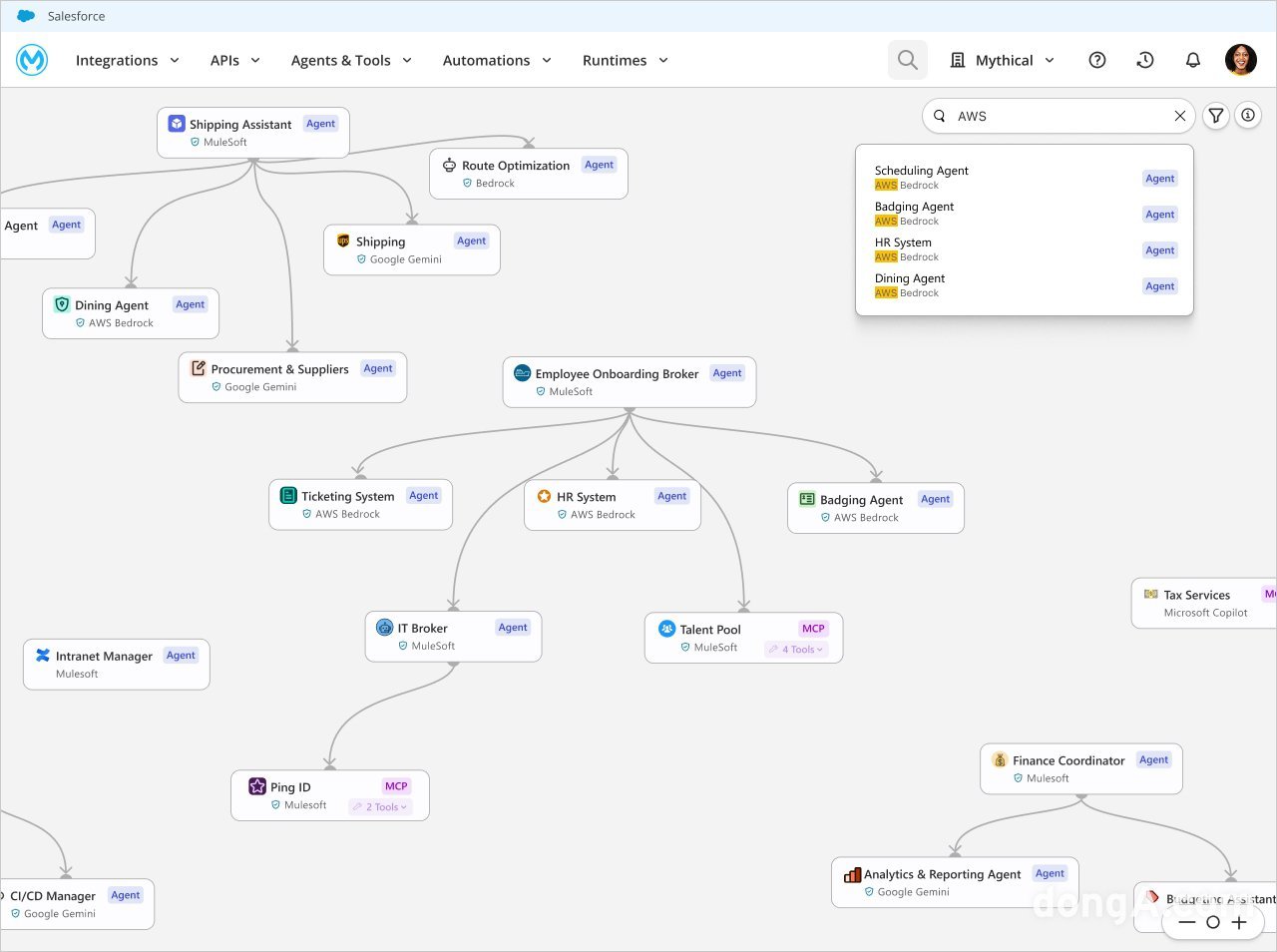 세일즈포스는 30일 기업 내 흩어진 AI 에이전트와 도구들을 효율적으로 통합 관리할 수 있는 차세대 플랫폼 ‘뮬소프트 에이전트 패브릭(MuleSoft Agent Fabric)’을 공개한다고 밝혔다. 이번 업데이트는 멀티 클라우드 환경에서 AI 에이전트를 자동으로 탐색하고 식별할 수 있는 기능을 갖췄다고 한다.