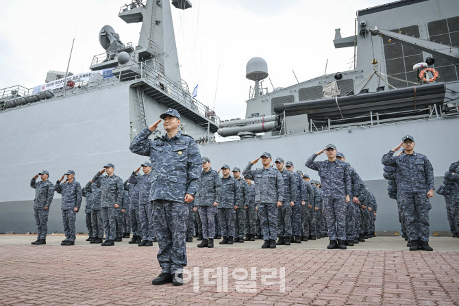 30일 오전 제주해군기지에서 열린 인도 국제관함식 및 다국간 해상훈련 밀란(MILAN) 훈련 출항 환송행사에서 윤혁민(대령) 강감찬함장을 비롯한 승조원들이 성공적인 임무완수를 다짐하며 기동함대사령관(임석상관)에 대한 경례를 하고 있다. (사진=해군) |
