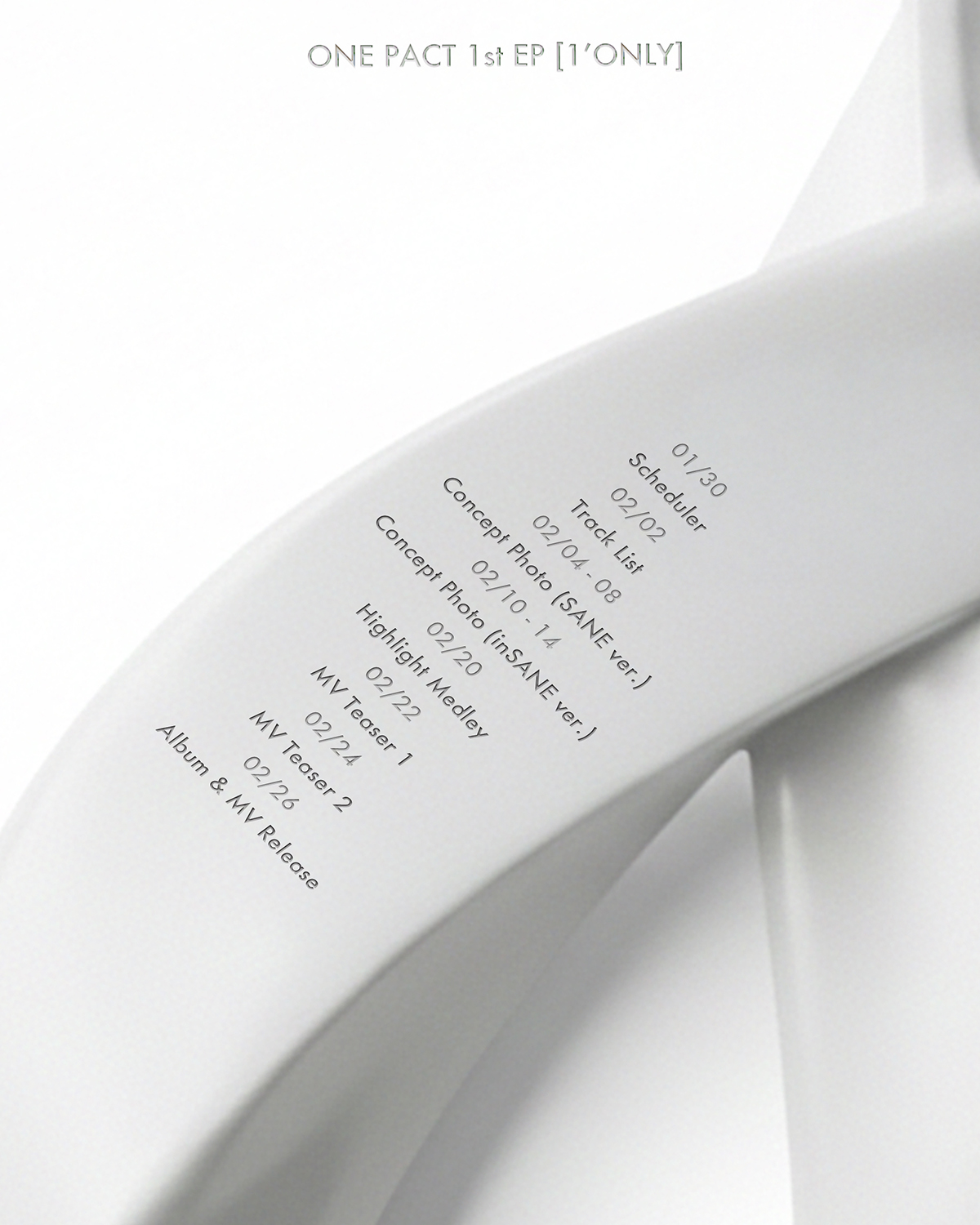 ONE PACT의 소속사 아르마다이엔티는 1월 30일 0시 공식 SNS 채널을 통해 1st EP '1’ONLY'의 프로모션 스케줄러를 공개, 컴백일을 오는 2월 26일로 발표했다.