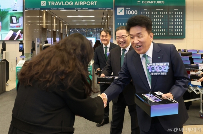 [서울=뉴시스] 김근수 기자 = 함영주 하나금융그룹 회장이 5일 오전 서울 중구 하나은행 을지로 본점에서 국내 해외여행 대표 플랫폼 '트레블로그' 서비스 가입자 1000만명 돌파 축하 기념행사에서 출근하는 임직원들에게 한정판 기내식을 전달하고 있다. (사진= 하나은행 제공) 2025.12.05. photo@newsis.com *재판매 및 DB 금지 /사진=김근수 |