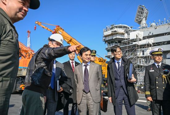 안규백 국방부장관이 30일 오전 미 해군 항공모함 조지워싱턴함 함상에서 함 승조원으로부터 함정에 관한 설명을 듣고 있다. 사진제공=국방부 |