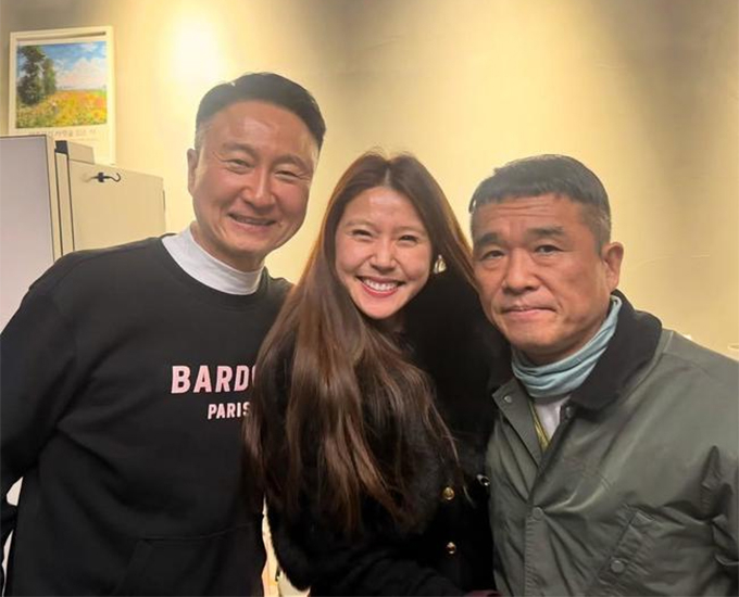 사진 속 주영훈은 아내인 방송인 이윤미와 함께 가수 김건모 옆에서 포즈를 취했다. 환하게 웃고 있는 주영훈 이윤미 부부와는 달리 김건모는 다소 경직된 모습이다. 이마와 미간의 주름도 눈에 띈다.