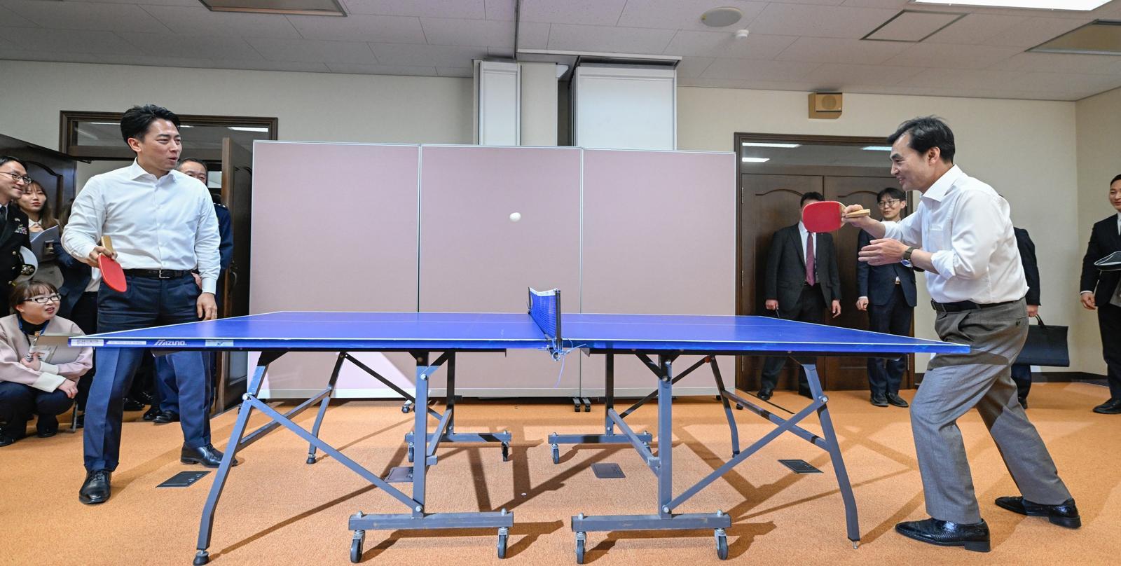 안규백 국방부 장관(오른쪽)이 30일 고이즈미 신지로 일본 방위상과 일본 요코스카에서 회담을 한 뒤 탁구를 치고 있다. 안 장관의 취미가 탁구인 점을 감안해 일본 측이 제안했다고 한다. 국방부 제공 |