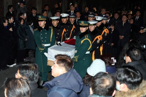 군 의장대는 태극기 관이 덮인 고인의 관을 장례식장 외부에 대기 중이던 운구 차량으로 옮겼습니다.