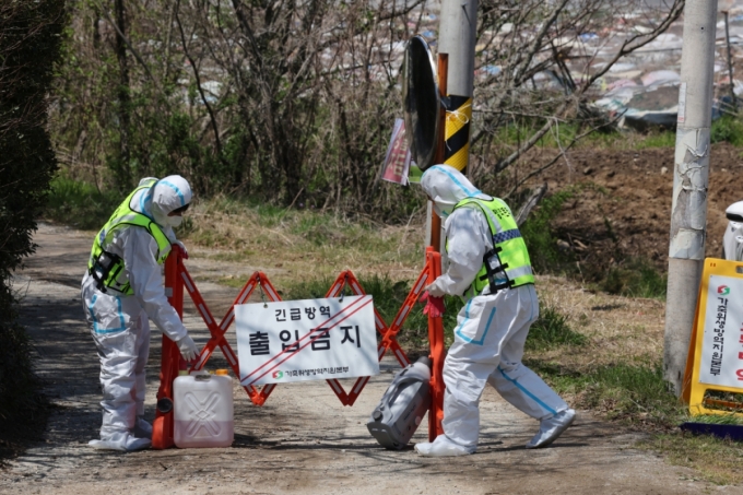 지난해 4월15일 구제역이 발생한 전남 무안군 일로읍 한 돼지농장에 방역본부 초동방역팀이 출입통제·소독에 나선 모습./사진=뉴스1 |