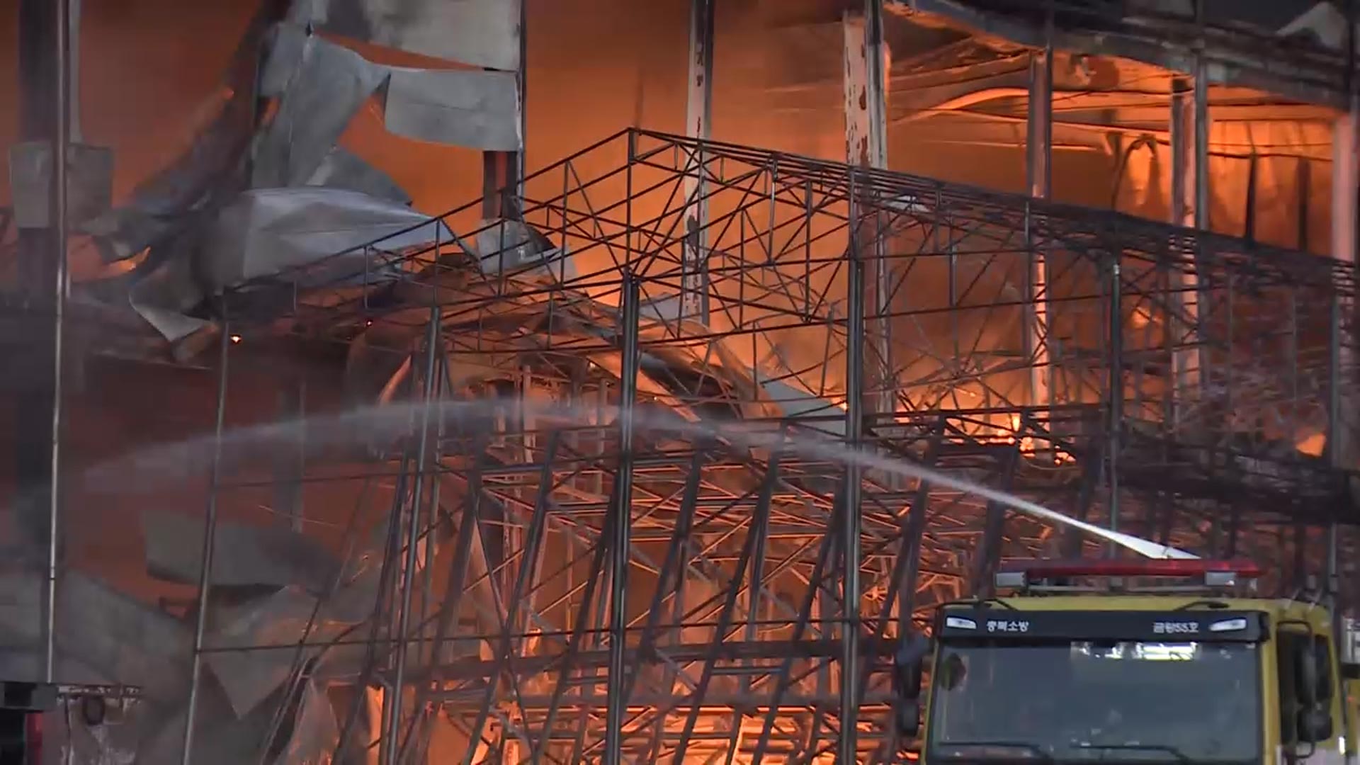 샌드위치 패널로 된 건물은 화재 열기로 곳곳이 녹아내렸습니다.
