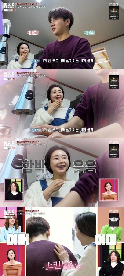 식사를 마친 진화는 함소원 대신 설거지를 하겠다고 나섰고 함소원은 고맙다며 함박웃음을 지었다. 함소원은 “진짜 많이 바뀌었네”라며 만족스러워했다. 진화의 등을 토닥거리며 스킨십을 하기도.