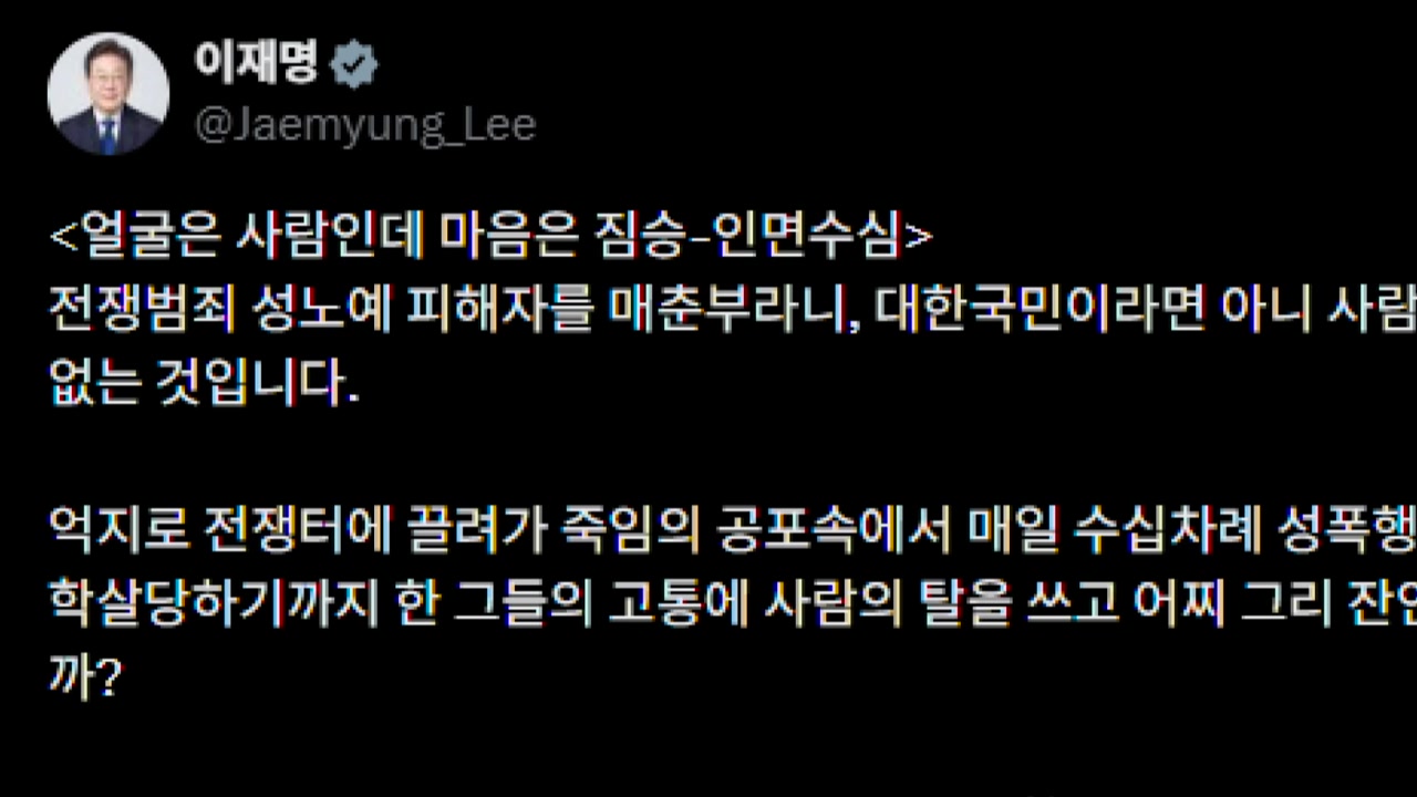 이재명 대통령은 위안부 모욕 단체를 겨냥해 얼굴은 사람인데 마음은 짐승인 '인면수심'이라고 질타했습니다.