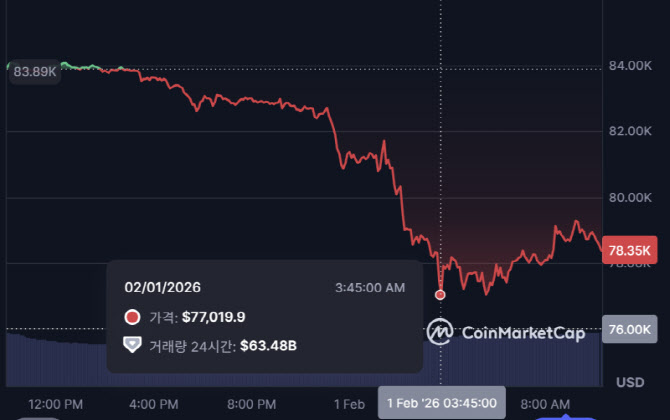 1일 코인마켓캡에 따르면 이날 오전 10시15분 현재 비트코인 가격은 24시간 전보다 6.63% 내린 7만8468달러 수준에서 거래되고 있다. 한때 7만7000달러까지 하락하다가 소폭 반등했다. 이는 작년 4월 이후 9개월 여만에 가장 낮은 수준이다.