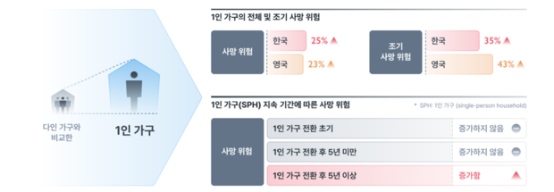 연구진이 2006년부터 2021년까지 약 15년간 한국 국민건강보험공단 자료(약 244만 명)와 영국 바이오뱅크 자료(약 50만 명)를 분석한 결과 1인 가구의 전체 사망 위험은 한국에서 25%, 영국에서 23% 증가했다. 특히 조기 사망 위험은 한국 35%, 영국 43%까지 높아져, 혼자 사는 중·장년층의 건강 취약성이 뚜렷하게 드러났다.