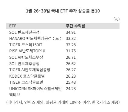 해당 기간 가장 높은 수익률을 기록한 상품은 ‘SOL 반도체전공정’으로, 일주일간 34.91% 급등했다. 이어 ‘HANARO 반도체핵심공정주도주’(33.32%), ‘TIGER 코스닥150IT’(32.28%), ‘RISE AI반도체TOP10’(31.75%) 등이 뒤를 이었다.