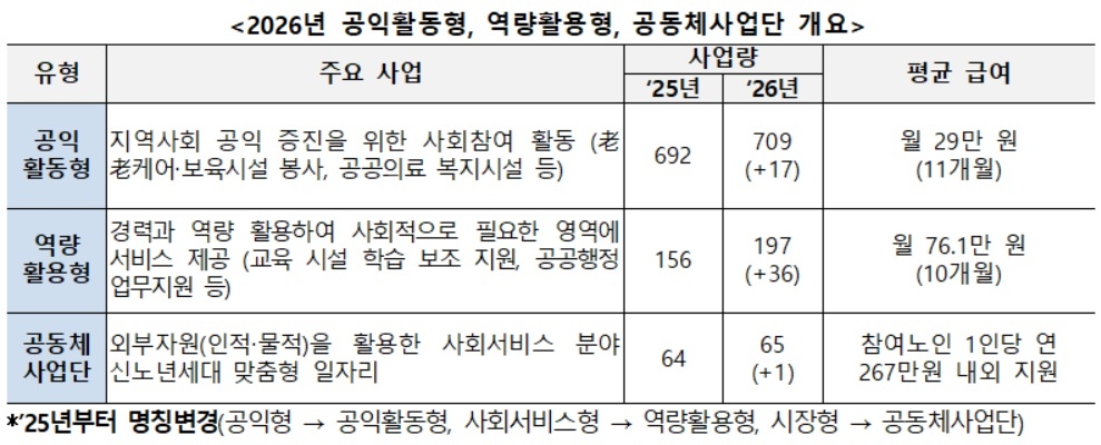 ‘공익활동형’은 2025년에 비해 1만7000개 늘어난 70만9000개, ‘공동체사업단’은 1000개 늘어난 6만 5000개를 제공해 저소득 노인의 소득 보충과 신노년세대 일자리 기회 제공을 지속 확대할 계획이다.
