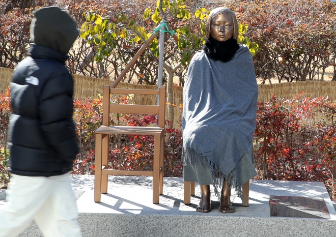 지난달 대구 중구 2.28기념중앙공원 앞 평화의 소녀상에 누군가 망토와 목도리가 둘러놓은 모습. 뉴스1 |
