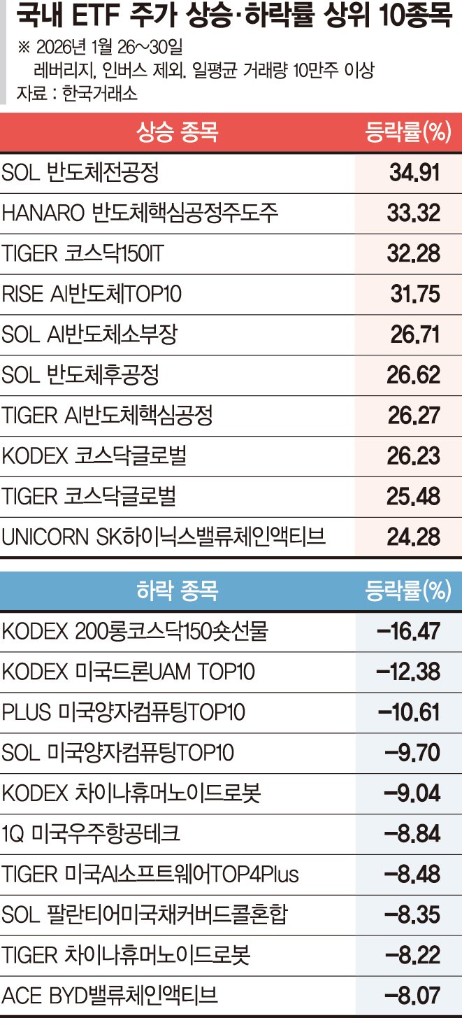 1일 한국거래소에 따르면 지난달 26일부터 30일까지 한주간 수익률 상위 10개 ETF는 대부분 반도체 공정과 AI 반도체 공급망 관련 상품으로 채워졌다. 반면 하위 10개에는 양자컴퓨팅과 휴머노이드 로봇, 우주·드론 등 미래기술 테마와 상대가치형 헤지 ETF가 대거 포진했다. 레버리지·인버스 상품과 일평균 거래량 10만주 미만 종목은 집계에서 제외된 기준이다.