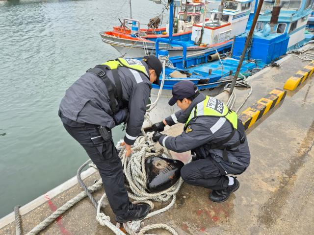계류어선 홋줄상태 점검. [사진=동해해경청] |