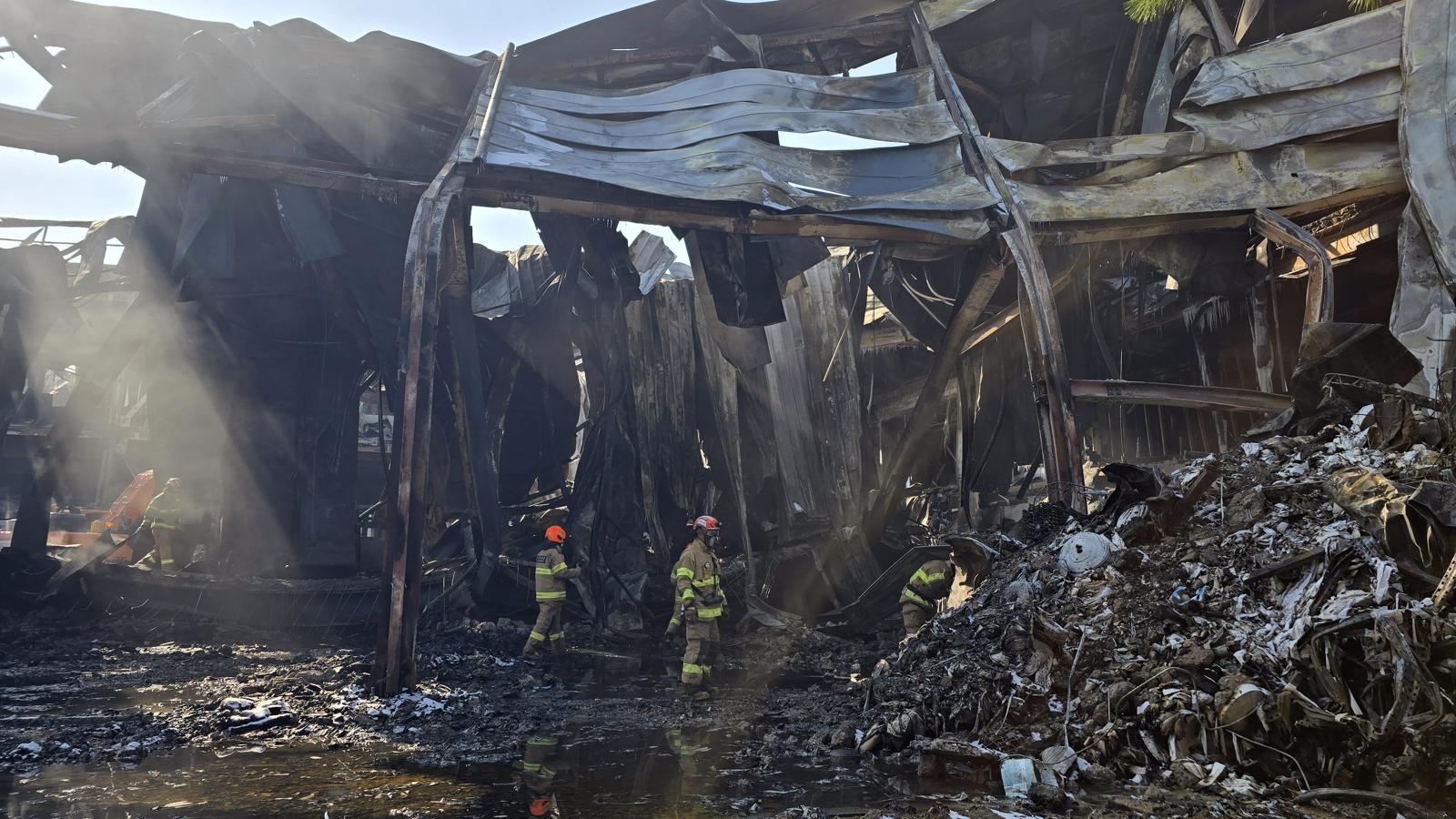 1일 오후 화재로 폐허가 된 충북 음성군의 한 생활용품 제조공장에서 소방대원들이 실종된 외국인 근로자 1명을 수색하고 있다. 지난달 30일 이 공장에서 발생한 화재로 또 다른 외국인 근로자 1명이 숨진 채 발견됐고, 주변 공장과 야산도 피해를 입었다.