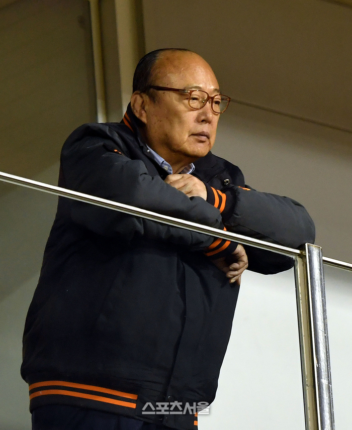 김승연 한화 그룹 회장이 지난 2018년 대전 한화생명이글스파크에서 진행된 한화 이글스와 넥센 히어로즈의 준플레이오프 1차전을 관람하고 있는 모습. 사진 | 스포츠서울DB |