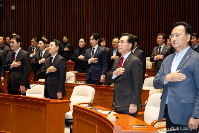 (서울=뉴스1) 유승관 기자 = 장동혁 국민의힘 대표와 송언석 원내대표를 비롯한 의원들이 2일 서울 여의도 국회에서 열린 의원총회에서 국민의례를 하고 있다. 2026.2.2/뉴스1 Copyright (C) 뉴스1. All rights reserved. 무단 전재 및 재배포, AI학습 이용 금지. /사진=(서울=뉴스1) 유승관 기자 |