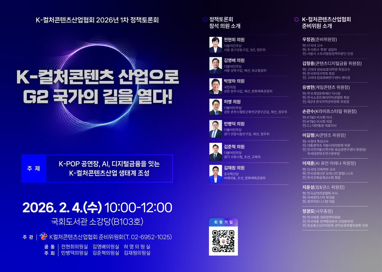 2부의 정책토론회 발제에선 ▷한국적인 5만석 규모의 아레나 인프라 구축(이재훈 단국대 건축학과 교수ㆍK-컬처 대형 공연장 어떻게 할 것인가) ▷디지털금융을 접목한 콘텐츠의 미래 모습(김형중 한국핀테크학회장ㆍK-컬처산업과 디지털금융의 융합) ▷AI시대의 콘텐츠 산업의 방향(박병훈 T3Q대표ㆍAI콘텐츠산업을 위한 데이터기반 AX 공통플랫폼 전략) 등의 K-콘텐츠 미래 전략이 다뤄진다. 이종섭 서울대 경영학과 교수와 신동재 다올건축사사무소 대표 등은 토론회 패널로 토론회에 참여한다.