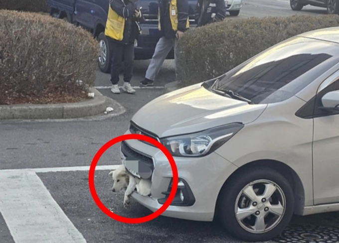 최근 한 온라인 카페에 "개 학대 아닌가요?"라는 제목의 글과 함께 사진이 올라왔다. 사진에는 차량 앞 번호판 아래 범퍼에 흰색 개 한 마리가 몸이 낀 채 늘어져 있는 모습이 담겨있었다.