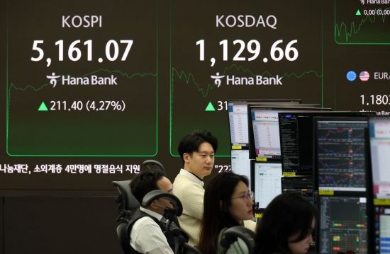 코스피가 폭락 하루만에 4% 이상 급등세에 매수 사이드카(프로그램매수호가 일시효력정지)가 발동된 3일 서울 중구 하나은행 본점 딜링룸에서 직원이 증시와 환율 등을 모니터하고 있다. 이날 코스피 지수는 전장 대비 165.14포인트(3.34%) 오른 5114.81에 장을 시작했다.