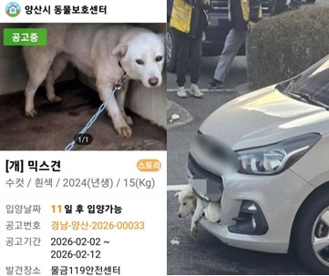사진에는 승용차 앞 번호판 아래에 흰색 개 한 마리가 차량 범퍼에 몸이 낀 채 늘어진 모습이 담겨 있었습니다.