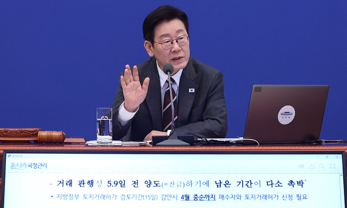 “양도세 중과 유예 없다” 단호 이재명 대통령이 3일 청와대에서 열린 국무회의에서 부동산 정책과 관련해 발언하고 있다. 이 대통령은 “대한민국 부동산 문제는 사회 발전을 통째로 가로막는 암적인 문제가 됐다”며 오는 5월9일 다주택자 양도소득세 중과 유예 조치를 종료하겠다는 입장을 재차 강조했다. 뉴스1 |