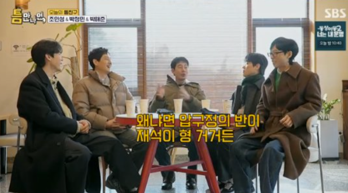 또 조인성은 "압구정 반이 유재석 거라는 말이 있다"라고 말해 유재석을 한숨 쉬게 만들었다. 유재석은 "조인성이랑 차태현 때문에 미치겠다. 자꾸 이런 가짜뉴스를 퍼트린다"라며 발끈ㄴ했다.