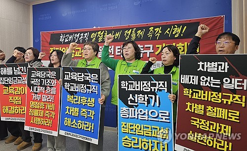 이들은 "다른 행정 공무직들은 정률제를 적용해 기본급의 120%를 명절휴가비로 받고 있지만 교육공무직만 정액제를 적용받고 있다"고 주장하며 "설 명절 전에 이를 도입하지 않으면 내달 27일 신학기 총파업에 돌입할 것"이라고 밝혔다.