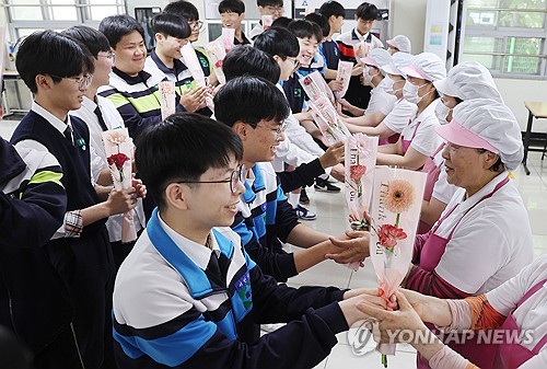 학생들로부터 카네이션 선물받는 부산의 한 급식실 노동자들 |