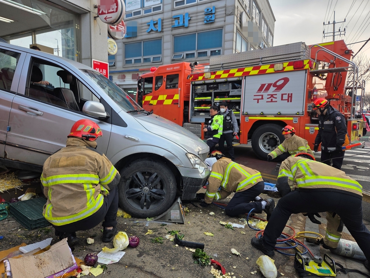 이 사고로 약국 앞에서 야채 장사를 하던 70대 A씨가 차량 바퀴에 깔려 심정지 상태로 병원에 이송됐으나 끝내 숨졌다. A씨와 함께 일하던 자매 관계의 70대 여성도 경상을 입고 병원 치료를 받고 있다.