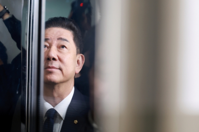 김병기 의원이 지난달 19일 서울 여의도 국회 소통관에서 기자회견을 마친 뒤 엘리베이터에 탑승하고 있다./사진=뉴시스. |