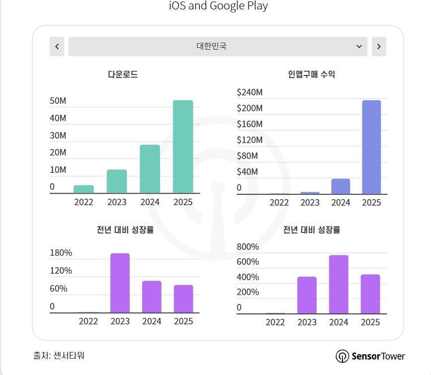 지난해 구글 플레이스토어와 애플 앱스토어에서 발생한 국내 생성형 AI 인앱결제 수익은 2억3500만달러로, 전년의 3830만달러보다 513.6% 늘었다. 같은 기간 다운로드 건수는 5390만건으로 1년 전보다 92.5% 증가했다.