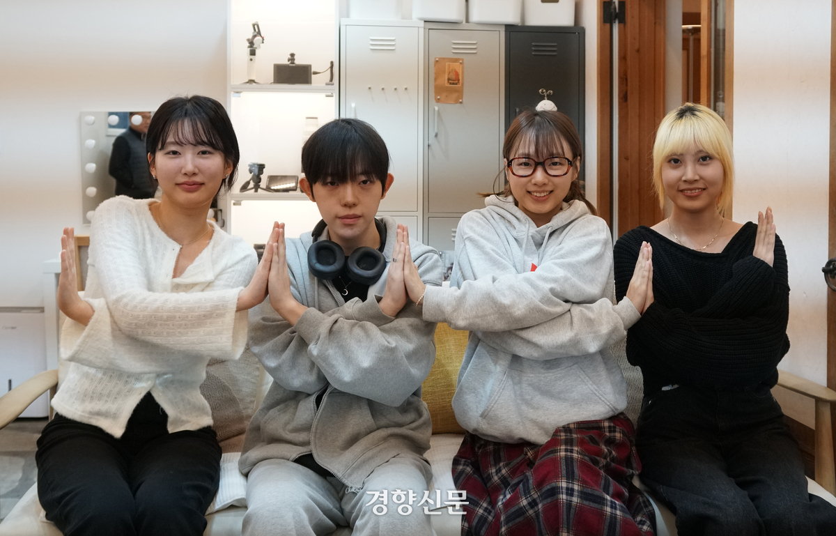 불교 크리에이터들이 ‘불교의 연기법식 합장’을 선보이고 있다. 계소영, 김성문, 주여진, 이승현씨(왼쪽부터). 박경은 선임기자 |