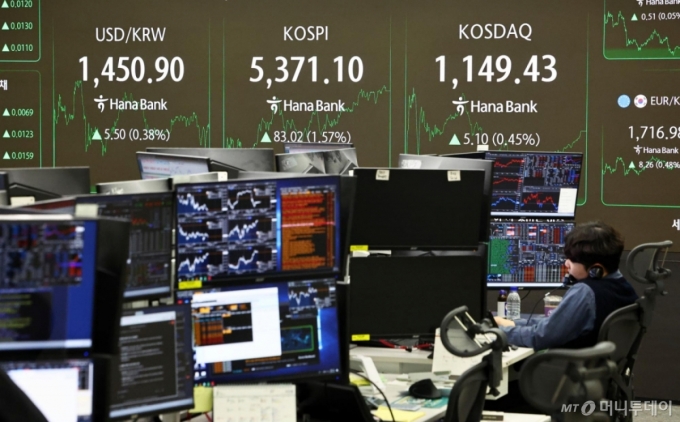 [서울=뉴시스] 김명년 기자 = 4일 오후 서울 중구 하나은행 딜링룸에서 딜러들이 업무를 보고 있다. 코스피는 전 거래일(5288.08)보다 83.02포인트(1.57%) 오른 5371.10에 장을 마쳤다. 코스닥 지수는 전 거래일(1144.33)보다 5.10포인트(0.45%) 상승한 1149.43에 거래를 종료했다. 서울 외환시장에서 원·달러 환율은 전 거래일(1445.4원)보다 4.8원 오른 1450.2원에 주간 거래를 마감했다. 2026.02.04 |