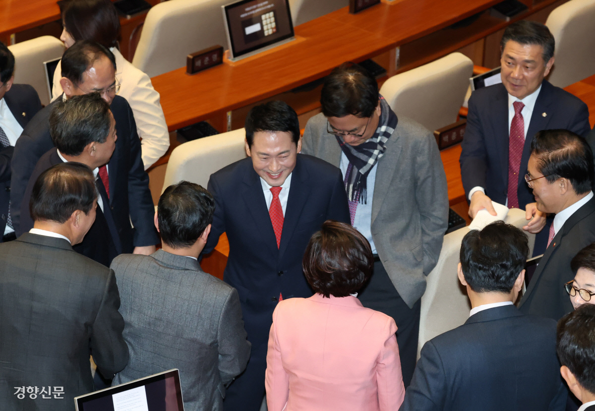 장동혁 대표 둘러싼 의원들 장동혁 국민의힘 대표(가운데)가 4일 국회 본회의에서 교섭단체 대표연설을 마치고 소속 의원들과 인사하고 있다. 박민규 선임기자 parkyu@kyunghyang.com |