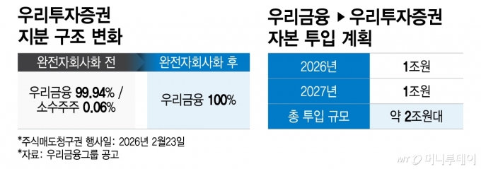 우리금융그룹이 자본비율 개선을 바탕으로 비은행 강화 전략 실행에 속도를 내고 있다. 계열사 완전자회사화를 추진하는 한편 우리투자증권에 대규모 자본을 투입해 은행·증권·보험을 3대 축으로 한 그룹 재편이 가시화하는 모습이다.