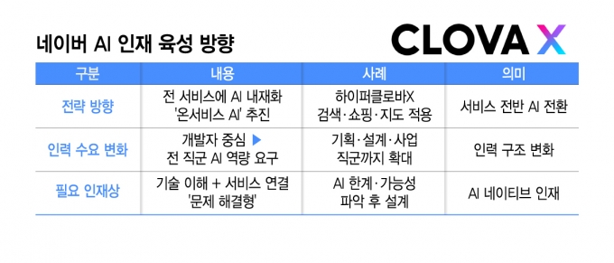 5일 IT(정보기술) 업계에 따르면 네이버는 자체 대규모언어모델(LLM) '하이퍼클로바X'를 검색, 쇼핑, 지도 등 전 서비스에 내재화하는 '온서비스(On-Service) AI' 전략을 추진하며 인력 수요의 구조적 변화를 체감하고 있다. 이제 기술적 구현 담당 개발자만 현장을 찾지 않는다.