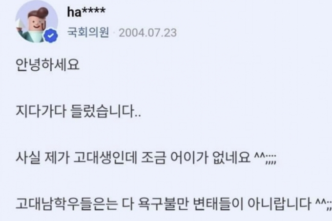 이 과정에서 천하람 개혁신당 원내대표의 글이 공개됐다. 천 원내대표는 2004년 7월 '고려대 남녀차별 심한가요'라는 질문에 답변을 남겼다. 그는 "고대 남학우들이 다 욕구불만 변태들은 아니다"라며 "몇몇 불미스러운 일이 있을 수는 있지만 그런 일은 본 적도 들은 적도 없다"고 적었다.