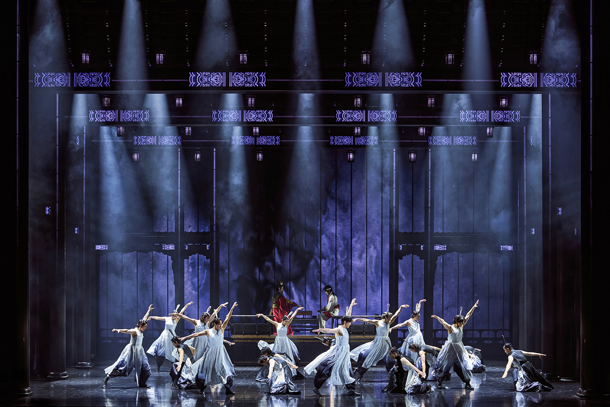 작품에선 소재 만이 아니라 무대 세트, 음악까지 ‘한국적’이라고 여겨지는 요소들을 두루 녹여냈다. 가장 눈에 띄는 부분은 LED 화면을 사용한 무대 디자인이다. 장치를 덜어낸 무대에서 거대한 화면은 장면마다 다른 분위기를 만들어낸다. 먹이 번지고 스미는 산수화의 질감이 무대 뒤편에 펼쳐지면, 차가운 권력의 공간인 궁궐에서 자연의 숨결이 흐르는 도원(桃源)으로 바껴 간다. 어스름한 달빛, 물 위의 윤슬, 타오르는 해까지, 화면은 공간의 정서를 빛과 색의 농담으로 조율하는 ‘움직이는 화폭’이 된다.