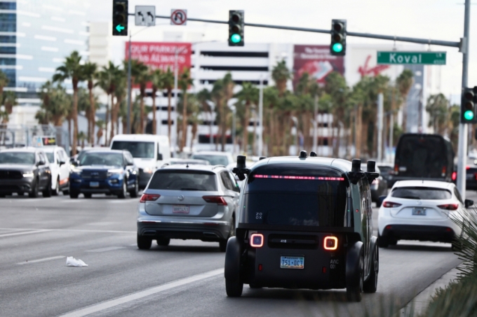 세계 최대 IT(정보기술)·가전 전시회 'CES 2026' 개막을 이틀 앞둔 지난달 4일(현지시간) 미국 네바다주 라스베이거스 거리에 아마존의 로보택시 '죽스(ZOOX)'가 도로를 주행하고 있는 모습./사진=뉴스1. |